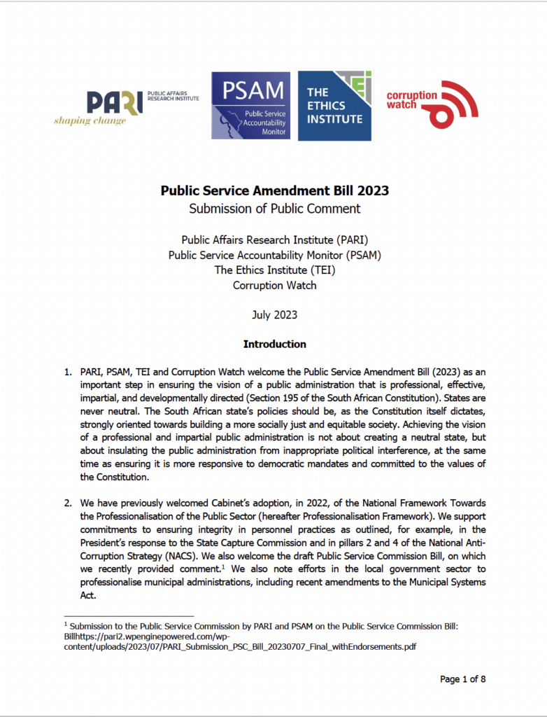PARI, the Public Service Accountability Monitor, the Ethics Institute, and Corruption Watch have made a joint submission to Parliament on the Public Service Amendment Bill. The Bill is currently before...