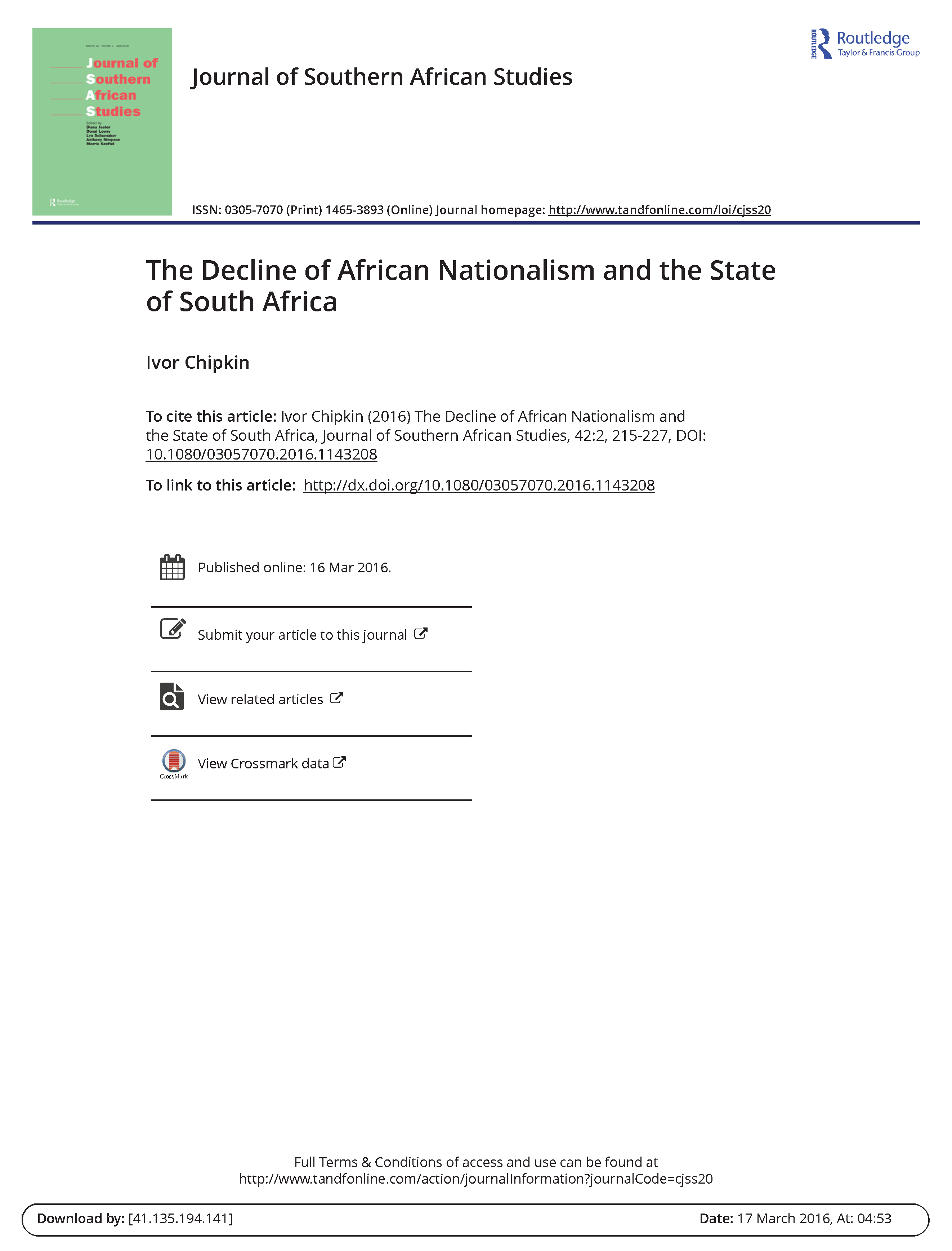 Ivor Chipkin (2016) The Decline of African Nationalism and the State of South Africa, Journal of Southern African Studies, 42:2, 215-227